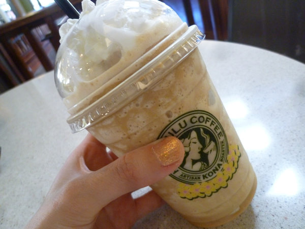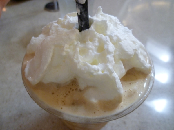 パンケーキ以外に特に食べたいものがなかったので、ドリンクのみをオーダーする事にしました。右上のKONA FROSTというカテゴリーがどうもホイップクリームが乗っているフローズンドリンクのようだ、とわかったのでそこからNutty Hawaiian(Sサイズで5ドル95セント)をオーダー。