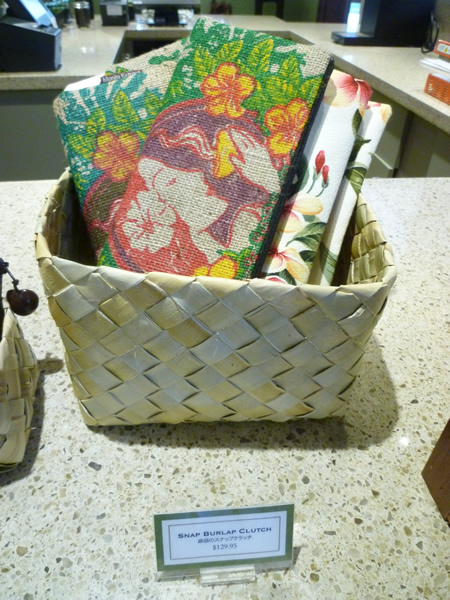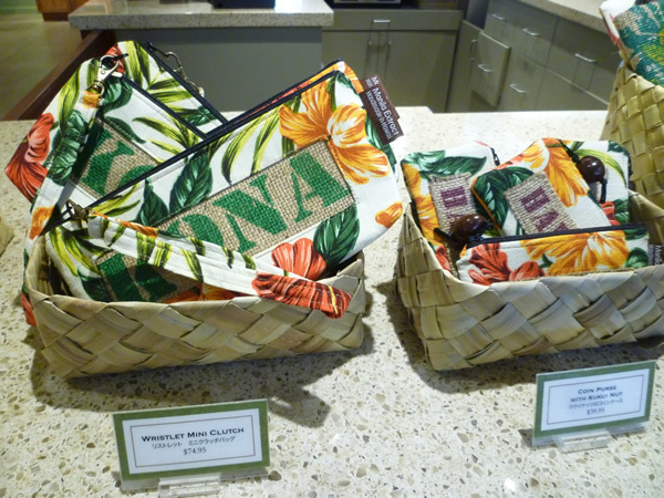 ドリンクを飲み終わり、ギフトショップを覗いてみる事にしました。駐車場側の入り口を入ってすぐ右手に広がるギフトショップ。すでに3時を回っていたからなのか、現地の方のブログで紹介されていたコーヒーの試飲はすでに終了しておりました…。ポットがいくつかあって自由に飲めたみたいです。ライオンコーヒーファクトリーと同じスタイルですね。お目当てのコーヒーの味がわかっていいかも。ホノルルコーヒーのロゴ入りのバッグ(10ドル)。私はあまりこういうロゴ入りの鞄は持たないんだけど、丈夫そうだったし普段使い出来そうでしたよ。収穫したコーヒー豆を入れる麻袋とハワイアンな柄の布地を組み合わせて作られたクラッチバッグ(129ドル95セント)。左:リストレット ミニクラッチバッグ(74ドル95セント)、右:ククイナッツのコインケース(39ドル95セント)。なかなかいいお値段です。
