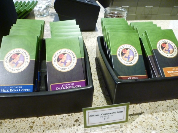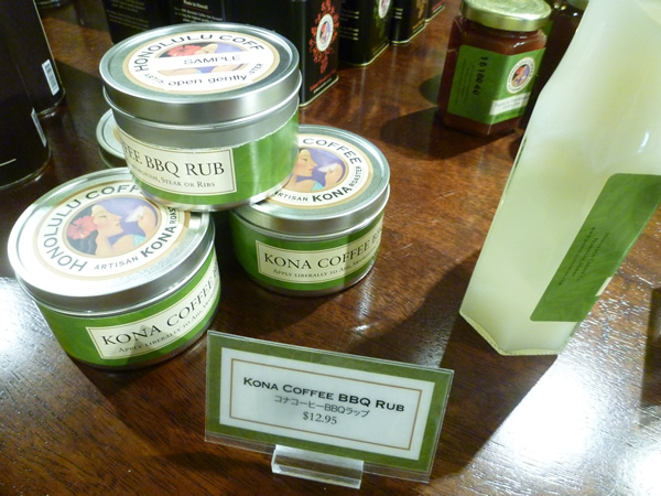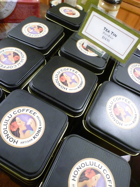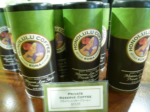 オリジナルのチョコレートバーは各種7ドル95セントでした。コナコーヒー入りとか、種類豊富なので食べ比べをしてみても面白そうです。販売しているのはコーヒーだけではありません。コナコーヒーBBQラップ(12ドル95セント)なんてものもあって、アメリカだな~って感じ。ティーティン(14ドル95セント)。缶入りのお茶ですね。見栄えもいいので、コーヒーが苦手な方へのお土産にいかが?プライベートリザーブコーヒー(15ドル95セント)。先にご紹介したバッグなんかと組み合わせて、ギフトバッグにしても素敵ですよね。