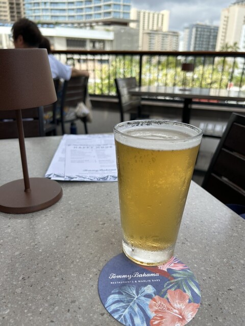 屋根のある席に座り、ハッピーアワーメニューから、ビール(数種類有)$7からロングボードをオーダー