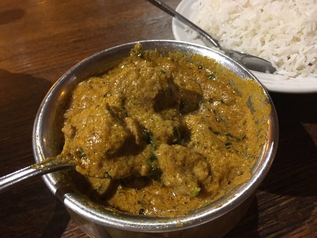 たっぷりと入ったヨーグルトで柔らかく煮込んだという羊肉は口に入れるとホロリとくずれて本当に柔らかく、カレーのソースもマイルドなんですが、スパイスがたくさん入っていて濃厚で奥深い味わい。カレーの中に見える緑の葉っぱはパクチーなんですが、カレーと一体化していて苦手なパクチーもいいスパイスになっていました。