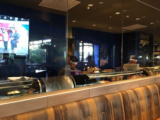 店内にはスポーツバーのようなバーカウンターと広々としたバーエリアがあったり、落ち着いて食事を楽しめそうなテーブル席もあったり、その奥にはガラス張りの厨房で寿司を握る寿司職人を見ることが出来ます。