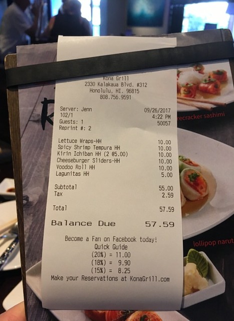 今回は小計55ドル、税込みで57.59ドルとなりました。もしこれをハッピアワーでないときに食べたとしたら、飲み物が23.5ドル、食べ物が70.5ドルの計94ドルにもなってしまいますので、39ドルも得したことになりますね!