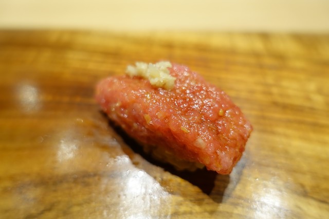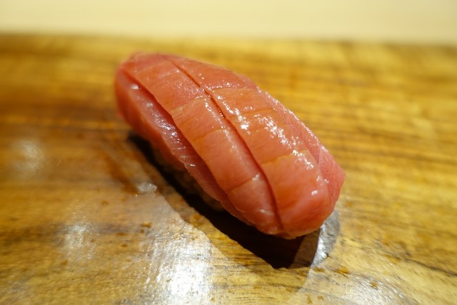 10日間熟成させたトロ。酸味と旨味が増し、先のマグロとはまるで異なる味わいでした。個人的には魚の熟成には否定的でありフレッシュに食べたい派ですが、このにぎりに関しては絶品と形容して差し支えないでしょう。