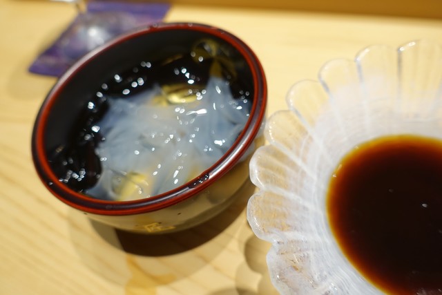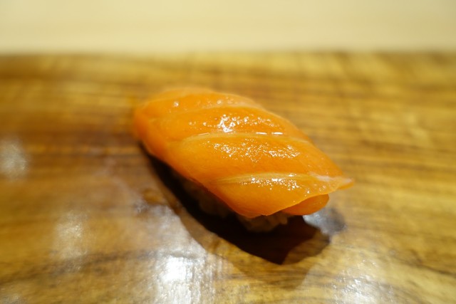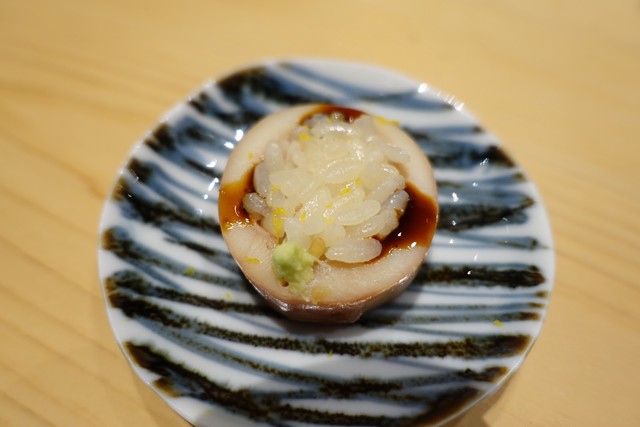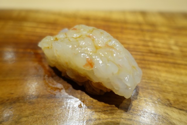 ここからはお好みで5~6種類が用意されており、また、これまでに食べたものをおかわりしてもOKです。私はボストン産のホタテを注文。おまんじゅうのように厚いホタテにほんの少し熱を入れ、丁寧に包丁で飾ります。上品に甘く奥行きのある味わいで、ボストン産だろうが何だろうが、ホタテとして素晴らしく美味。