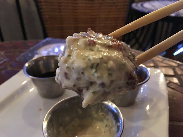 ひとつめはガーリックカーリーフライドポテト5ドル(1ドル引き)。ニンニクたっぷりのガーリックオイルが想像以上にたっぷりかかっています。写真だとわかりにくいですが、器のそこにはアヒージョのごとく、ガーリックオイルの海が出来ていました。