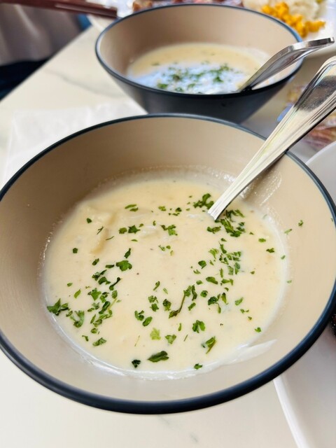 最初にドリンクとリリハベーカリー名物のこんがりと焼かれたバターロールはとても美味しそうでクラムチャウダーのスープも、メインのお肉が出て来るまでの前菜を楽しみながら会話も弾みました。