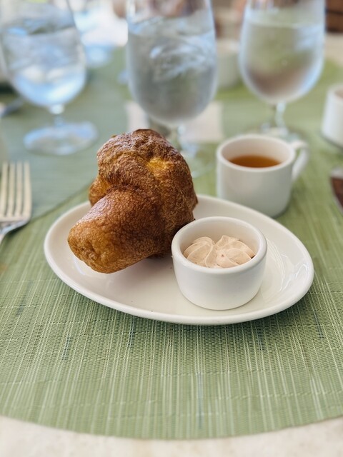 なんかチキンコンソメスープとシュー生地っぽいパン。たぶん無料。パンは名物ら...