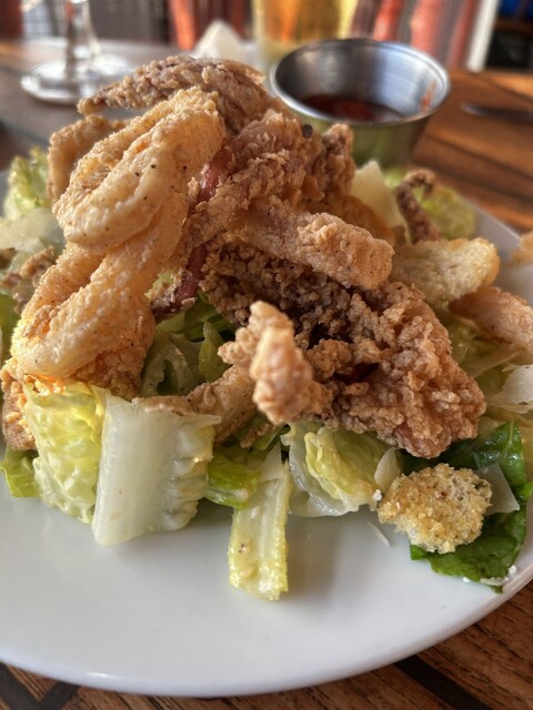 プライムリブロースとシーフードパスタ、カラマリフライの乗ったシーザーサラダを