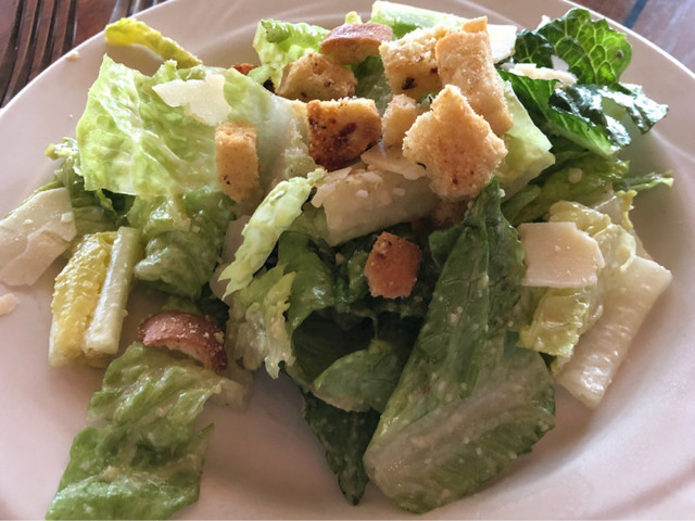 プライムリブロースとシーフードパスタ、カラマリフライの乗ったシーザーサラダを