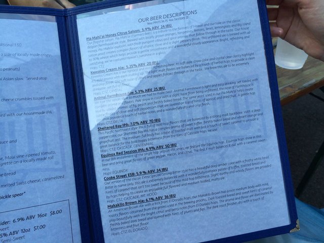 ビールの種類は全部で9種類のようです。1パイント(16oz)で$6.75と昨日行ったワイキキ・ブリューイング・カンパニー同様、お得感のある値段です。1パイントと量が多めなのもいいですね!