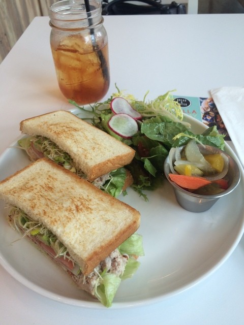 ということで、スモークアヒ サンドイッチ$13とピーチマンゴーアイスティ$2.50を