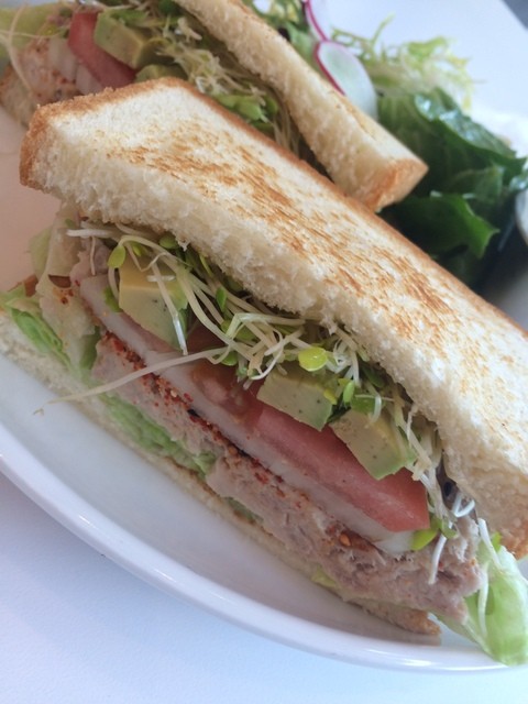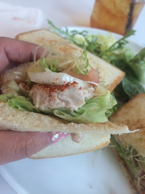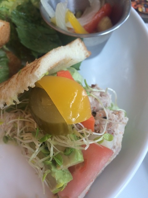 サンドイッチの中にもスプラウト、生のオニオン、トマト、アボカドがぎっしり!