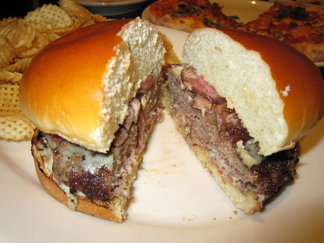 挽きたての牛肉、バルサミコローストオニオン、シャープホワイトチェダーチーズ、トマト、