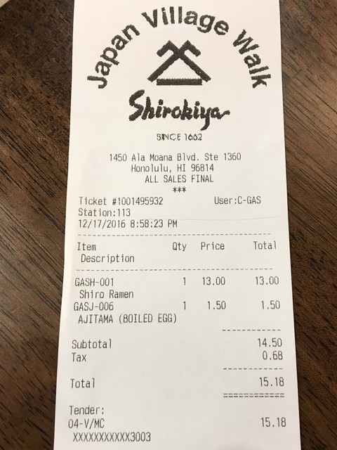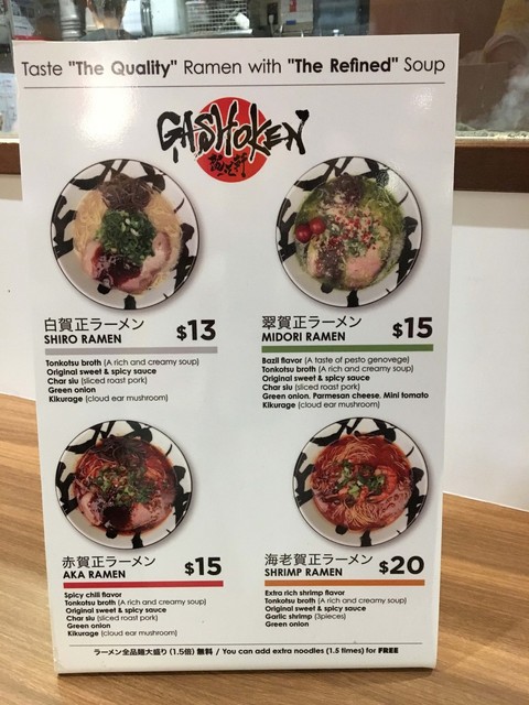 * 白賀正ラーメン 13ドル(約1,521円) (1ドル≒117円で換算)