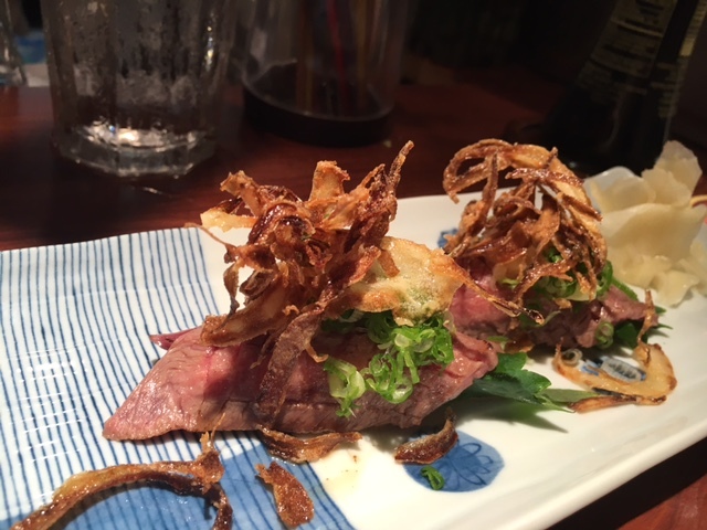 うっすらと炙った牛肉の上にポン酢ベースのソースが軽くかかって