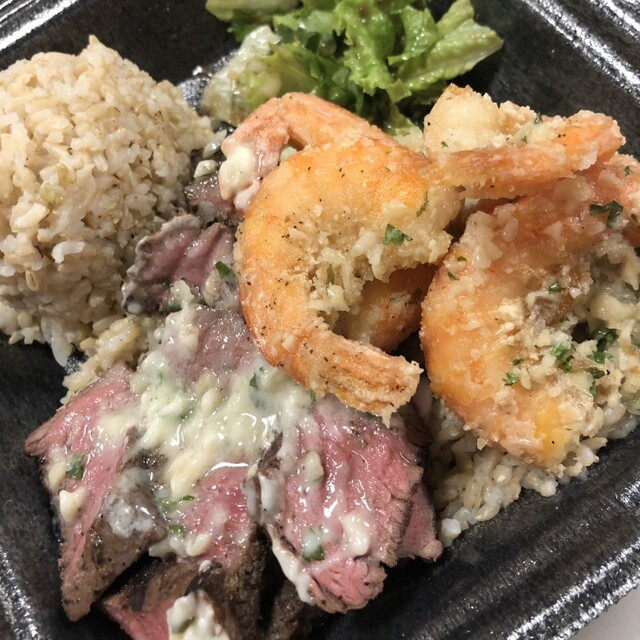 ステーキのプレートランチとガーリックシュリンプのプレートランチを注文しました。