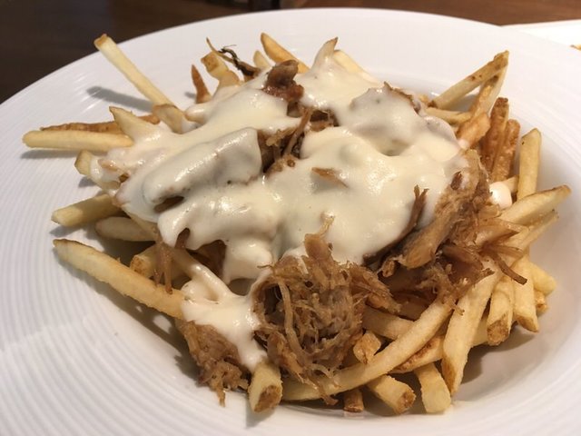 マックフライポテ風の細めのポテトフライに、カルーアポークとクリーミーなチーズがかかっています。