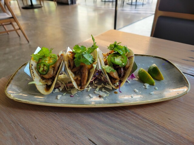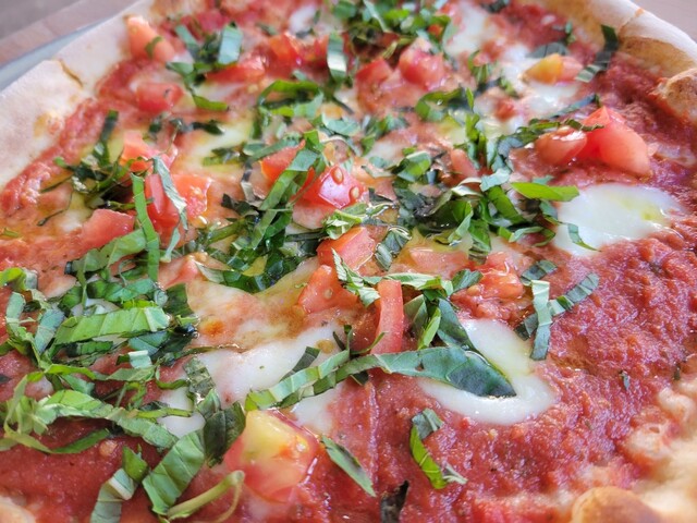 タコスはパクチーやナンプラーの効いたアジアンテイスト。複雑な味が混ざり合って美味しい。続いてピザのマルゲリータ(16ドル)を席で追加。ピザは生地が薄めのパリパリで軽快さがあり、トマトの旨味もじんわり伝わってきます。2つのメニューだけでも、人気店であることがうなづけます。