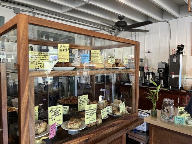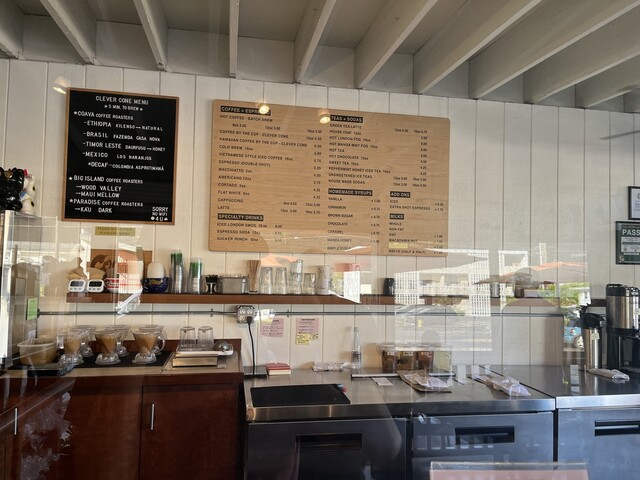 マノアの滝への道中での朝食に利用。結構ある駐車スペースに車を停め、現地到着は平日8:30頃。待ち客7〜8人。丁度店の前の傘付きの席が空いたので確保。客は老若男女でほぼローカル。購入したのはアイスコーヒー($5)、ラテ(レギュラー $5)、リリコイローフ($3)、スコーン($4)。