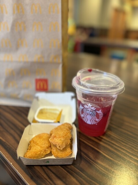 チキンマックナゲットは個数が選べるので、4個入りを注文しました。おやつにはちょうど良い量でした。日本と違ってソースは色々と種類があり、今回はハニーマスタードを選びましたが予想通り美味しかったです。