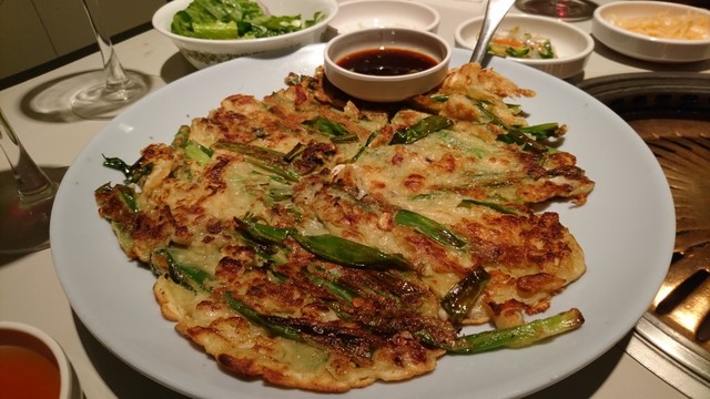 今回は、いつもの骨付きカルビ以外に、海鮮葱チヂミを注文しました。