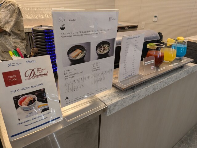 飲み物はカウンターのスタッフに注文。シャンパーニュはプレーンなテタンジェ。ハワイのラムを用いたカクテルなども用意してくれます。うどんやアサイーボウルなどややこしい料理もここで注文し、ブルブル震える番号札を手渡されるという運用です。