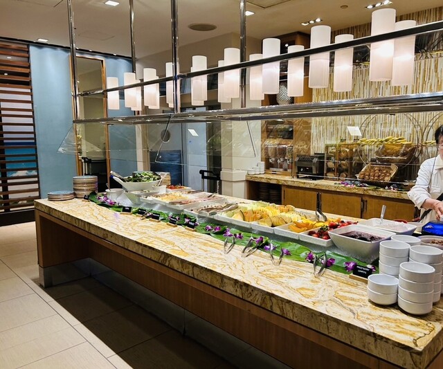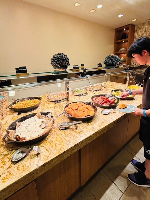 今回はまだ外も暗く朝早かったのかスムーズに案内され、豊富な種類の食材が並べられているテーブルや棚から好きな食材を選びお皿へ、