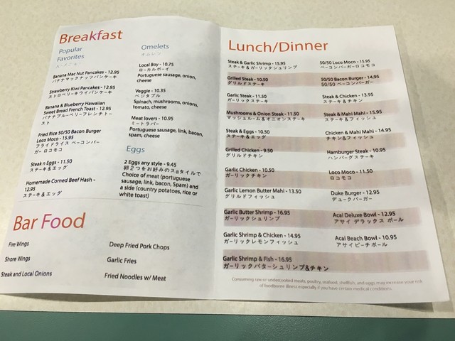 これは2つ頼んでシェアした方が賢明だろうという事で、頼んだのは「ステーキ&ガーリックシュリンプ $15.95」と「ベーコンバーガー ロコモコ $15.95」、それにジャンボサイズの「ジンジャエール 値段失念」♡