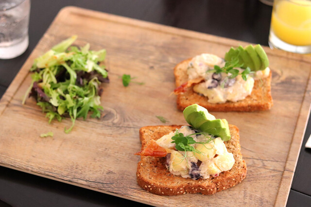 クリームチーズをたっぷり塗ったタロ芋マフィンの上に