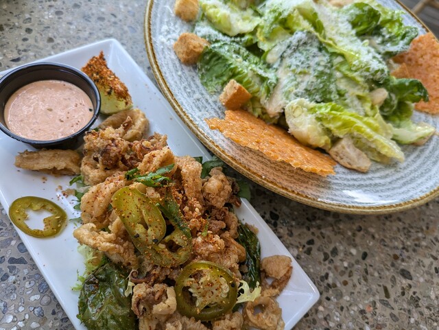 カラマリ。単にイカを揚げただけでなく、ハラペーニョやシシトウも組み込まれており、ディップするソースにも存在感があります。七味唐辛子なども添えられており、日本人の琴線に触れる味覚です。