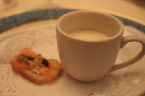 着席と同時にジャガイモのポタージュ ミッシェルズからのご挨拶の様です