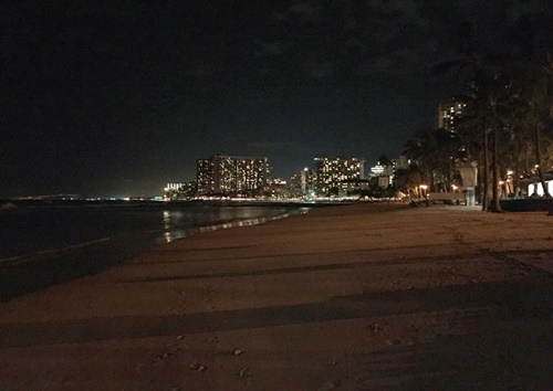 ワイキキの夜景を眺めながらビーチ沿いを歩いて帰っても15分ほど・・・