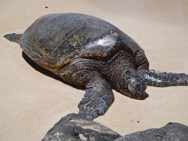 オアフ島の北側にラニアケアビーチというほぼ100%ウミガメが甲羅干しとかエサを食べている海岸があります。