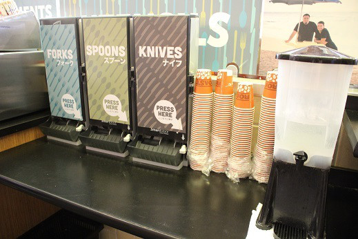 レジ横にはフォークやナイフ、セルフのお水もありますよ。