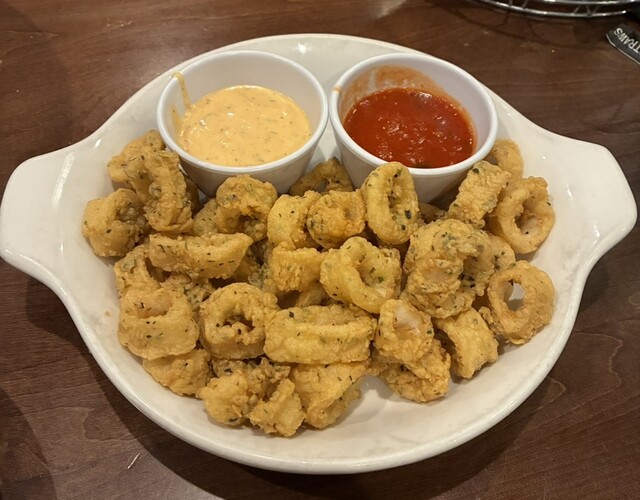 注文はお代わりし放題のSALADA $19.29、CALAMARI $17.99、GRILLED CHICKEN MARGHERITA ...