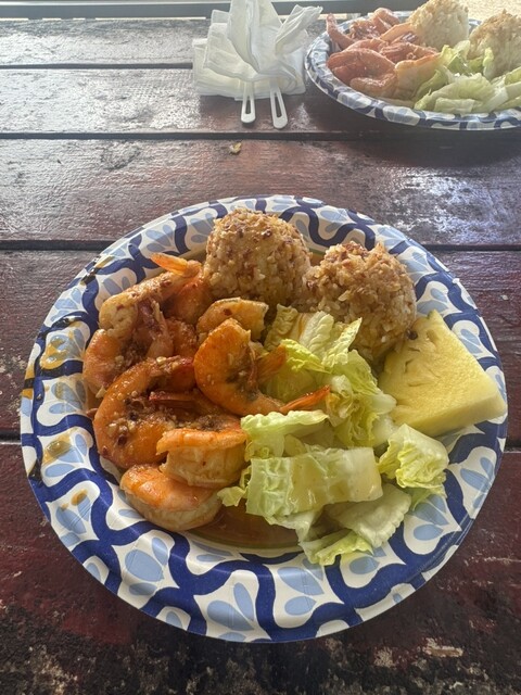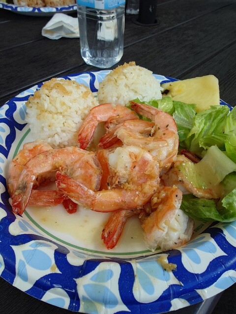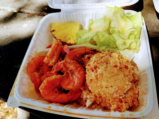 旅行代理店主催の、パッケージツアーのランチでついてきました。いわゆるキッチンカーで提供している、ガーリックシュリンプのプレートランチです。洗い物を減らすためか、プレートというかディスポーザブルトレイで...