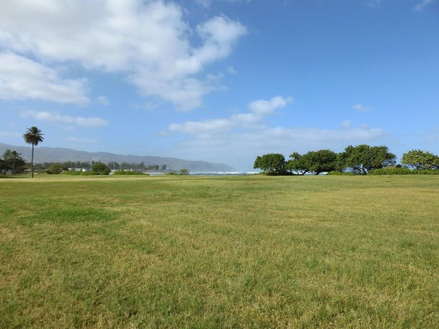 青い海、白い砂浜の前は、一面緑の穏やかな公園になっていて、