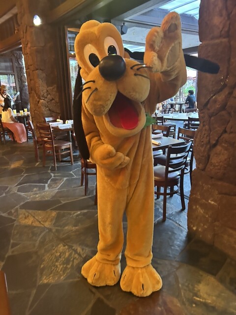 2025年3月時点では料金が一人当たり55ドル(別途チップ)に値上がりしていましたが、ディズニー好きには必見のキャラクターダイニングでした!予約時間は7時にしましたが、朝一は人が少なめなのでキャラクターが2-3回遊びにきてくれました♪ミッキーと写真撮影した後にテーブルに案内され、ランダムの3キャラクターが食事中に会いにきてくれるシステムです(私の時はミニー、プルート、スティッチでした)✨予約する際にアニバーサリーの有無を入力する欄があり、ハネムーンにチェックを入れていたところクッキーのプレゼントがありました(4枚目の画像の缶バッチはフロントでもらいました)。