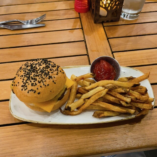 生演奏を聴きながらカジュアルにハンバーガーやサンドイッチ、パイ、飲み物をいただけます。