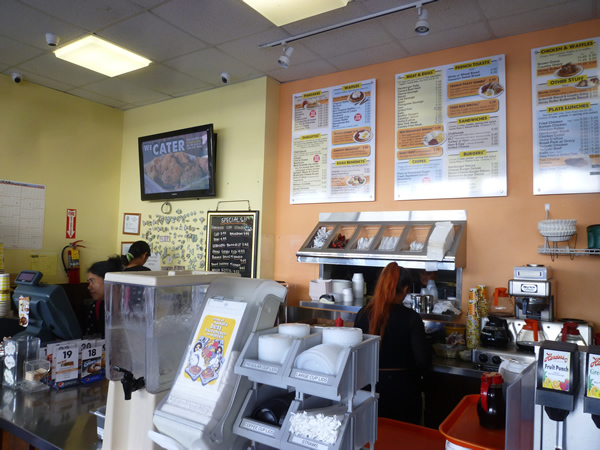 CHICKEN & WAFFLESメニューの中から、Honey & Butterの2pc(9ドル99セント)。これ、チキンが3個だと11ドル49セントです。ソースも他にグレイビーソースとかあるんだけど、私は甘じょっぱいハニー&バターで!ここで食事をされた方々のブログやインスタグラムで写真を見てはいたけれども、いざ自分の目の前に登場するとものすごい迫力…!これは写真を撮りたくなるはずだわ。店名の通り、パンケーキとワッフルが主力メニューな訳なのですが、このチキン&ワッフルは別格扱いになっているみたいです。知人は何かサンドイッチかハンバーガーらしきものを注文したみたいです。プレートランチやロコモコ、クレープなどメニューは本当に豊富!