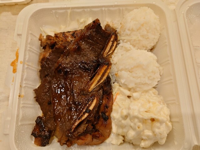 クィーンズマーケットプレイスのフードコートに入って、最初のお店、左側。バーベキュープレートは牛・豚・鶏をテリヤキソースで。ライス二つにポテトサラダ。ボリュームタップリでした。お値段もお手軽で、絶えず注...