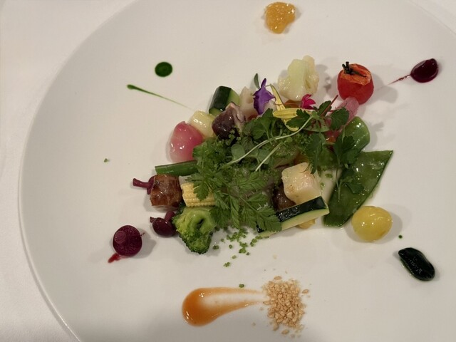 芸術品のようなお料理で、美味しいだけでなく目でも楽しめました。一番気に入ったのは「24種の野菜」の一皿で、美しく、味わいも優しくて、毎日でも食べたくなるような感覚でした。ニ番目は雲丹とクリームチーズ、...