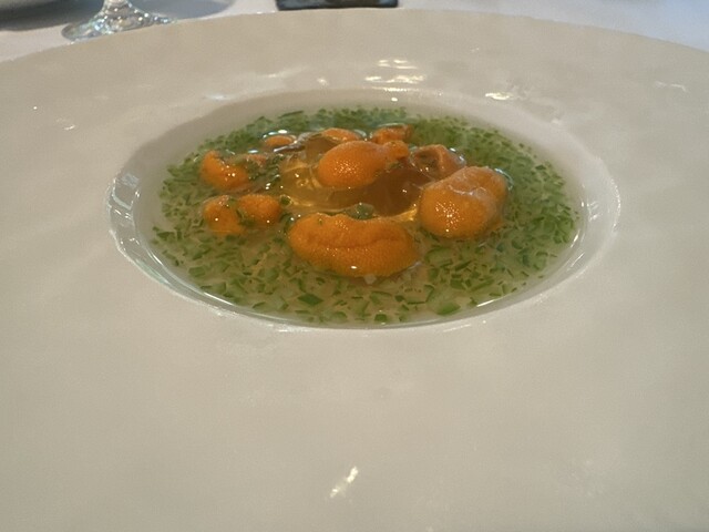 バフンウニのコンソメジュレのせオクラの冷製スープ