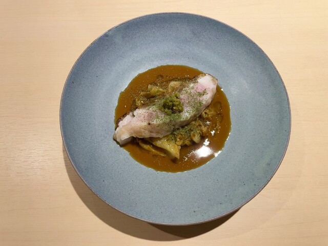 メヌキのオリーブオイルのソテー 炭火で炙って 縮緬キャベツ ブイヤベース 柚子胡椒