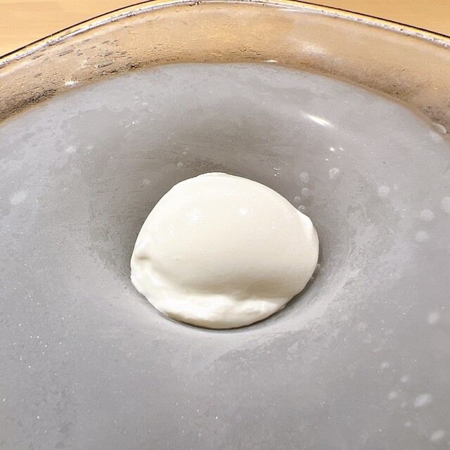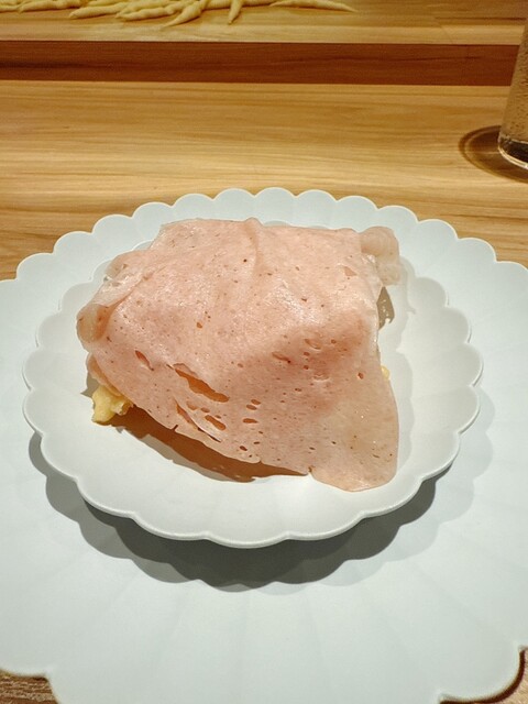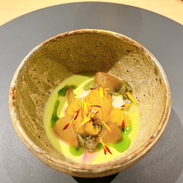 北寄貝、ウィスキーの水溶液、アスパラガスピューレ、桃、じゅんさい、キタムラサキウニ、バジリコ