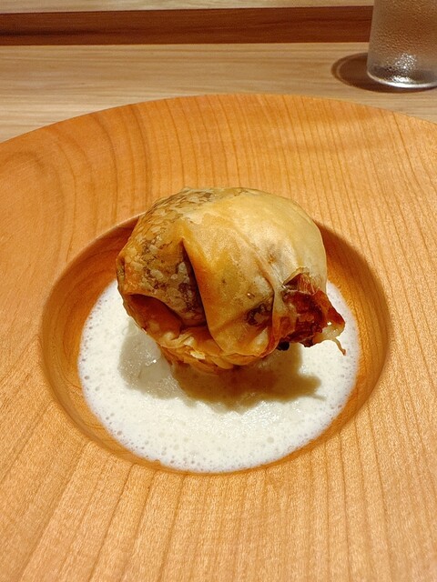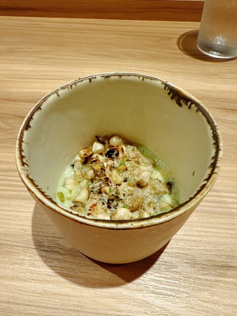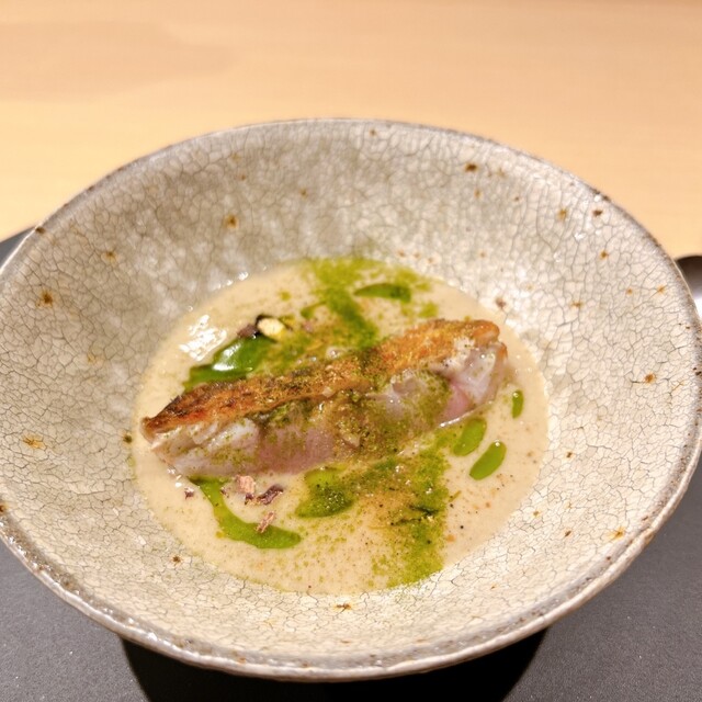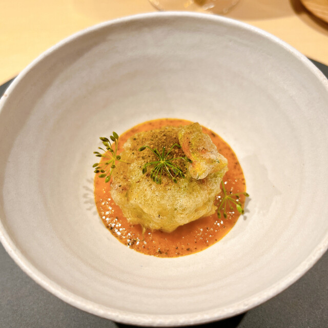 めぬき 獅子唐薪焼き 渡り蟹のビスクソース 燻製させたおうな