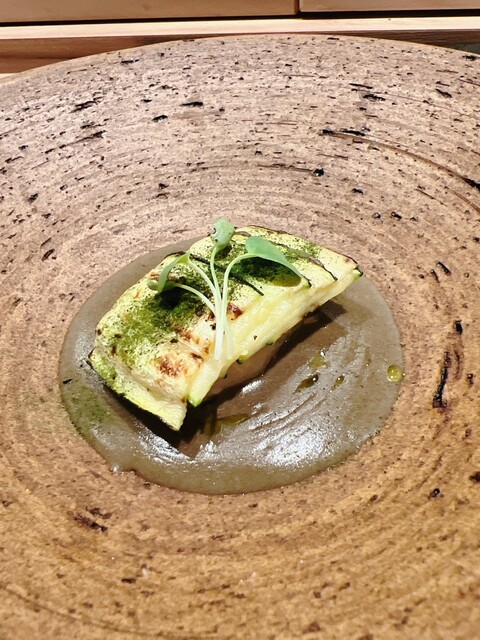 ひらめの薪焼き ズッキーニ カプナータひじきパウダー ほうれん草パウダー