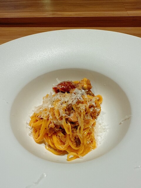パッケリ、フルーツトマト、唐辛子ハバネロのオイル、パルミジャーノ