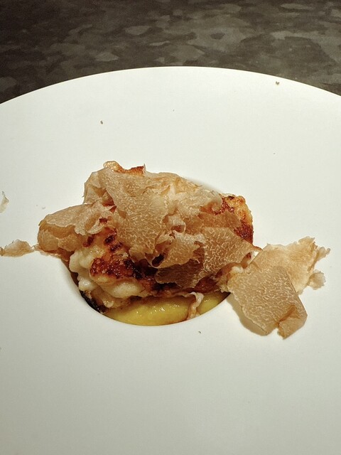 白子入り酒のムニエル、黄色ネギのピュレ、白トリュフ